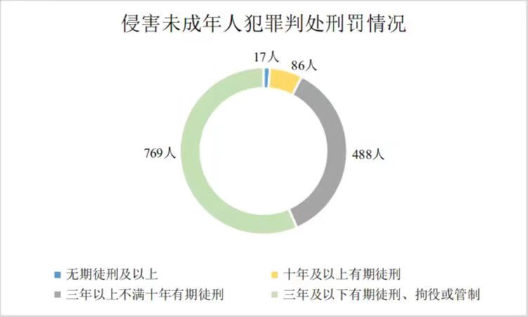 批准逮捕侵害未成年人犯罪1035人,提起公诉1687人。法院作出有罪判决1360人,其中无期徒刑及以上17人,占1.3%;十年及以上有期徒刑86人,占6.3%;三年以上不满十年有期徒刑488人,占35.9%;三年及以下有期徒刑、拘役或管制769人,占56.5%。