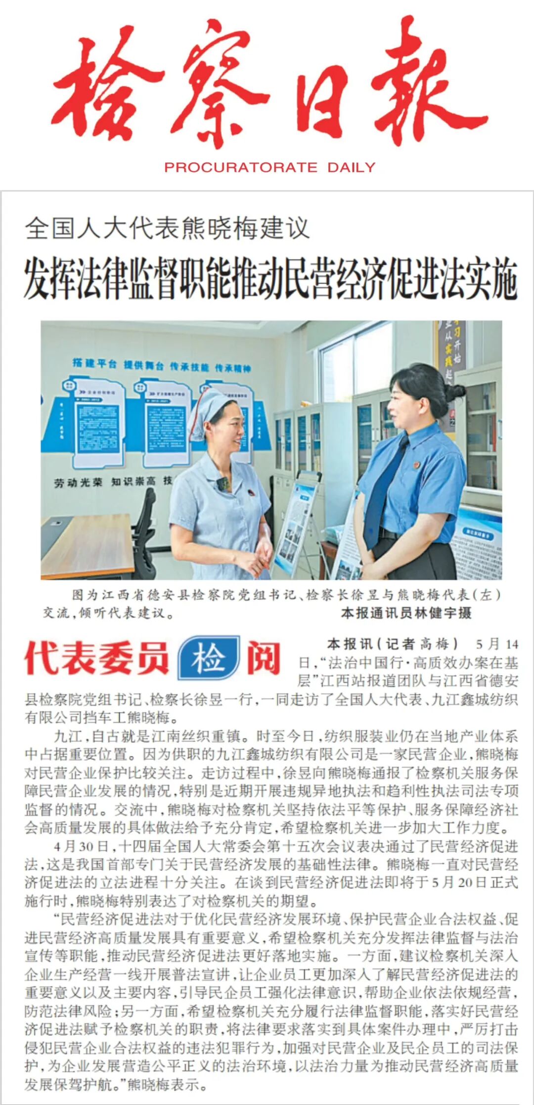 5月14日,“法治中国行·高质效办案在基层”江西站报道团队与江西省德安县检察院党组书记、检察长徐昱一行,一同走访了全国人大代表、九江鑫城纺织有限公司挡车工熊晓梅。